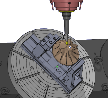 The 5X Expert menu provides additional and more powerful tools to tackle the machining of very complex parts. One common example of such a part is the impeller shown in the image. However, these tools are not proprietary to GO2cam, so the workflow slightly differs. GO2cam’s calculation is based on the solid model. Hence even when a face is selected to apply machining on, the software recognizes that face in association with the solid part. The 5X Expert module operates as a surface-based calculation engine. When a face is selected, only that surface is recognized, while associated solid surfaces remain undefined until specified in the process. | ![]() | |