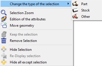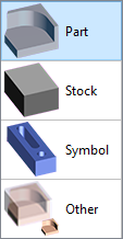 Type | Here, the purpose is to define the use of the element later in GO2cam. The cell offers 4 possibilities: Part: solid to machine, Stock: the solid(s) selected are automatically transformed into machining stock, Symbol: selection of work-holding and clamping elements, Other: solid to keep but which is not of any other of the 3 families. While creating the automatic stock, this element will not be taken for the calculation of the bounding box. For example, it can be the origin, which is sometimes designed as a solid. The choice can be done solid by solid, which is probably often the case for part and stock. But it is also possible to make a multiple selection and accede to the popup menu to choose the type of element. You can read more explanation in next page. | ![]() | |
