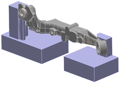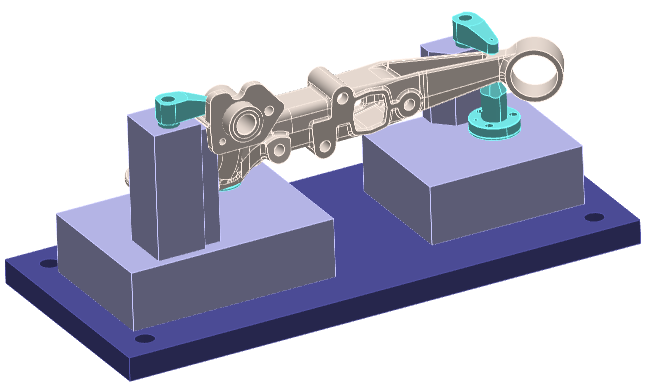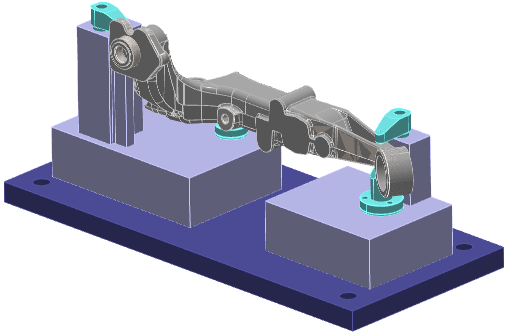 This assembly includes the part with its cast stock, and some clamping elements: The second solid (the dark blue plate) is not correct. It is not considered as a useful element, we cancel it from the import, The 4 clamping elements are hidden, The types ‘Part’, ‘Stock’ and ‘Symbol’ have been given to the different elements. The part with its holding device is ready for machining. | ![]() |