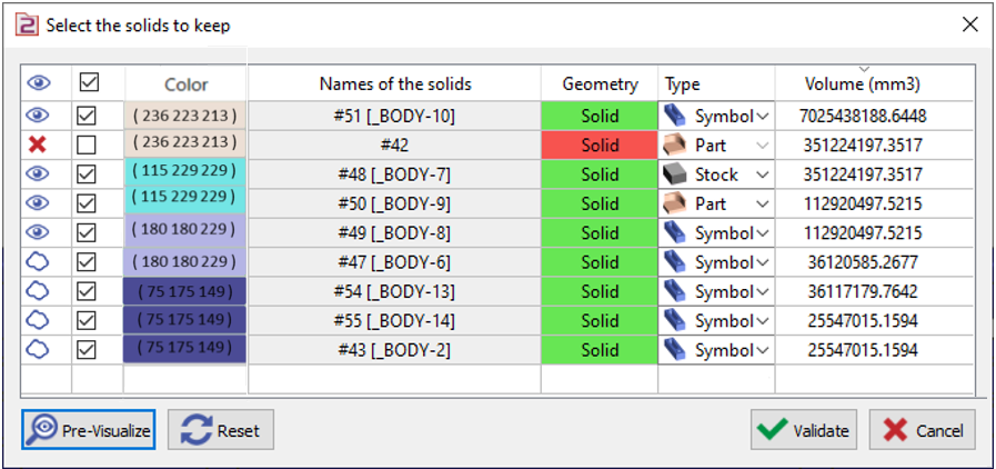 ![]() | Selection for the import | The box is checked by default, all the solids are selected for the import if we validate like this. But if you ‘uncheck’ one box of solid, then it is not taken for the import. In this case, the Red Cross icon is displayed in the column of visibility, the show that the solid is removed from the process. | |