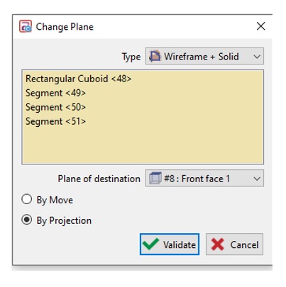 2 different modes are available: ![]() | By move The new plane is assigned to the elements, which are moved into the plane. | By projection The new plane is assigned to the elements, and the elements stay as they are; their coordinates maybe 3D in that new plane. |