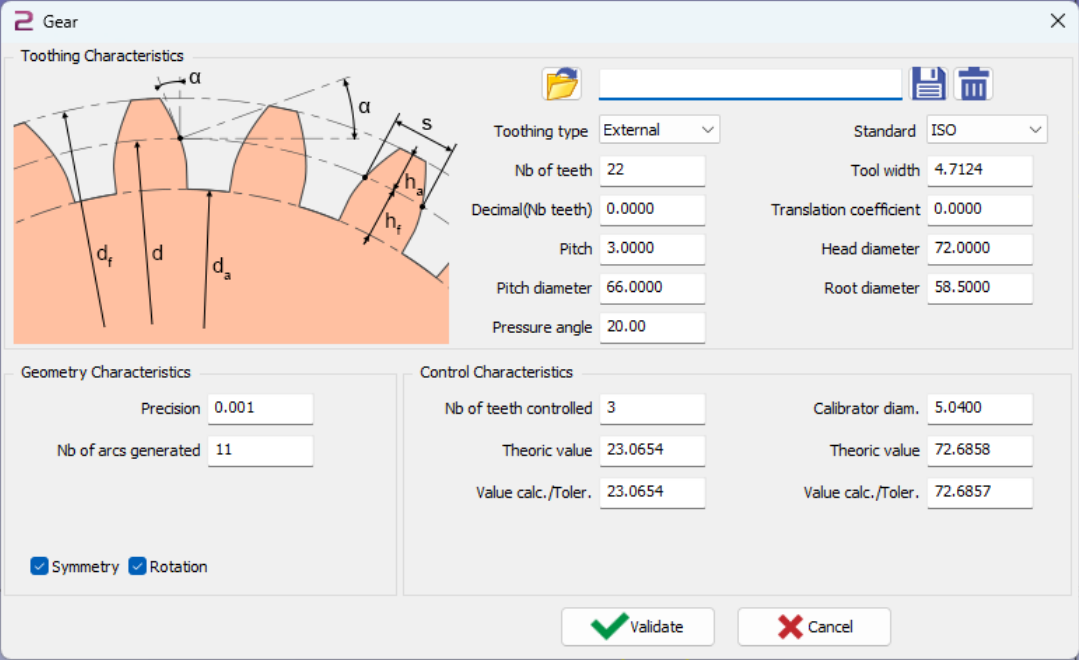 For the three fields of right you define a callibrator diameter. It means it will be positionned between two teeth. After positionning we will measure the distance between opposite calibrators.