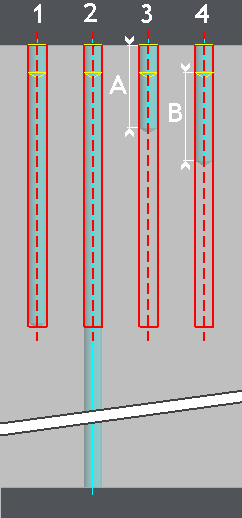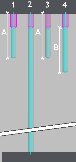 Stock (case 2): The machining is done through material. Manual / Entity (case 3): A value has to be entered manually in the field Depth (value A). The depth is defined according to the entity (hole or circle) Z positioning. Manual / Stock (case 4): A value has to be entered manually in the field Depth (value B). The depth is defined according to the stock value. As a prepiercing operation is defined, the depth is calculated from the bottom of the prepierced hole. | ![]() | ![]() |