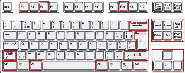 F10 | To activate the options of the menu bar. - The arrows Right/Left/Up/Down enable to navigate in the menus and submenus - Esc: to qui a menu level - enter: to validate the item of the menu |