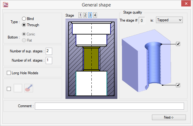 In a very friendly user interface, define the topology of the hole (blind or through), the number of stages and the quality of the stages (smooth, counter bored, tapped).