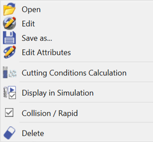 Edit | Opening the material file to create or modify the characteristics of a material and accede to the cutting conditions editor | |