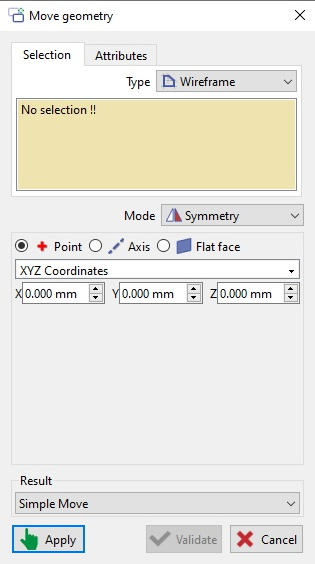 Here, you can choose the element according to the type of solid (Wireframe, Solid or both) and the mode to Move/Duplicate the geometry. For different modes, you would have to input different corresponding values.