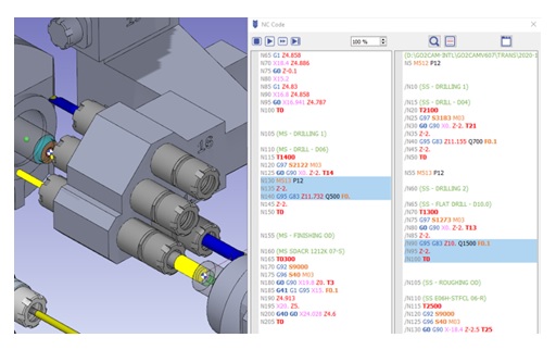 All new standard PP includes the Syntax coloring and applies it automatically (Fanuc (ISO default), Siemens, TNC, APT, etc.): | User can get access to an editor multi windows for channels as shown below: |