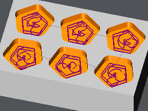 The pockets selected are machined one after another; if a pocket is divided by an island, the 2 sides are considered as 2 pockets and machined separately. Consequently, this option is very good in case of multi-selection, if the pockets to machine are not divided into many subpockets. It minimizes the number of rapid paths between pockets. The example above is perfectly adapted to this option. Organization by pockets would not be much adapted to the next example: here, the part has 2 pockets, one with an island and the other is divided in 2 because the tool can not machine the part at one time. In the video, take a look at the path and note how the pockets are machined with too many rapid paths between the areas. | ![]() |