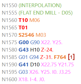 Plunge Feedrate = 1200 | The tool plunges with the value 1200 [2] then start working by modifying the feedrate back to the standard value [3]. | ![]() |