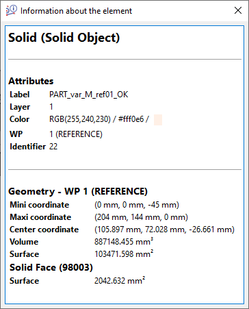 Access to the entity information of the solid by doing a right-click on a face to have information about the whole solid surface or the solid face only as shown on the right.