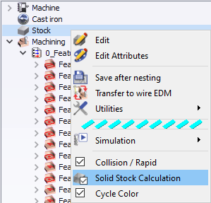 it is the 3D material shown on the screen. In Milling, Turning and Wire edm, it is automatically calculated according to the operations programmed. In 3X Milling it is set OFF by default, because its calculation can be very long. You can change this behaviour with the option ‘Stock calculation of the complex cycles’ in Tools>Options>Milling. You can also set the calculation ON and OFF with the commands in the Machining Tree, by right-click in ‘Stock’ line or in the ‘Operations’. If Stock line is ON, you can choose for each single operation to calculate the stock or not. If it is OFF, the grey stock is not calculated at all. | ![]() ![]() |