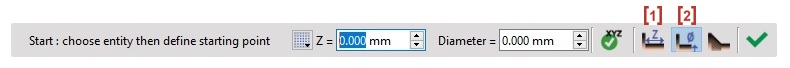 Start the design by selecting a point, then the shaft device activates automatically and alternatively lengths (along Z-axis) [1] and diameters (along X-axis) [2].