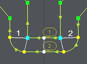 We want to create synchro points between the 2 corners already treated : click on [4], click on the 2 synchro points already defined (1 and 2 on the image) to limit the zone to treat, all the extremities of the 2 profiles are linked 2 by 2. |