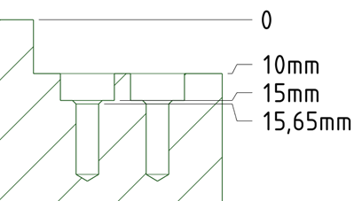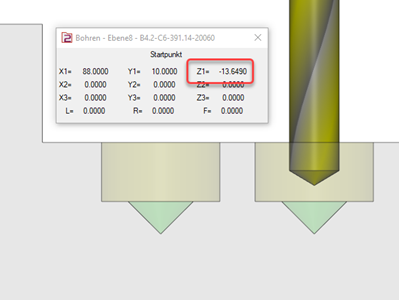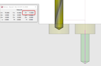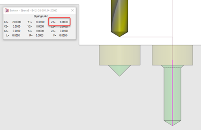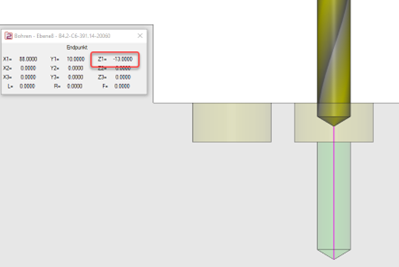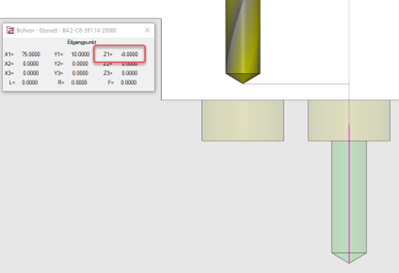 For the case where a chamfer is defined and pre-machined for the counterbore, the calculation of the safety distance takes into account the chamfer resulting in the safety distance for the drill being slightly deeper. For instance at Z -13.65 rather than Z -13 in the example. The switch between the drilling cycles are still carried out at Z -8, hence a safe flow is guaranteed.