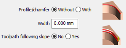 In most cases where no chamfer is designed on the solid or profile (Profile/chamfer is set to Without). The size of the chamfer on the XY plane is determined by the parameter Width. If the chamfer is already designed, the Width parameter is obsolete (Profile/chamfer is set to With) and the size is automatically read on the solid. For information about Toolpath following slope, click here. |