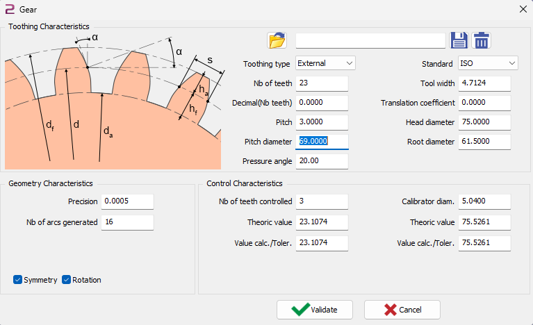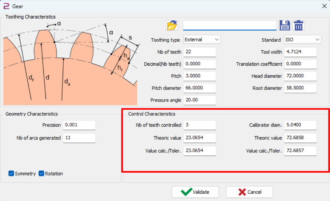 For the three fields of right you define a callibrator diameter. It means it will be positionned between two teeth. After positionning we will measure the distance between opposite calibrators.