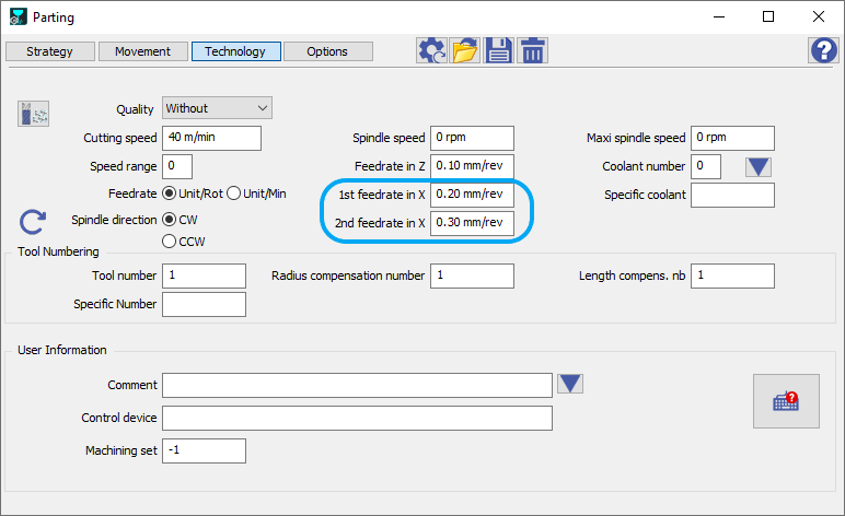 This parameter allows to define the diameter at which a feedrate change(defined in the technology tab) will occur during the parting cycle.
