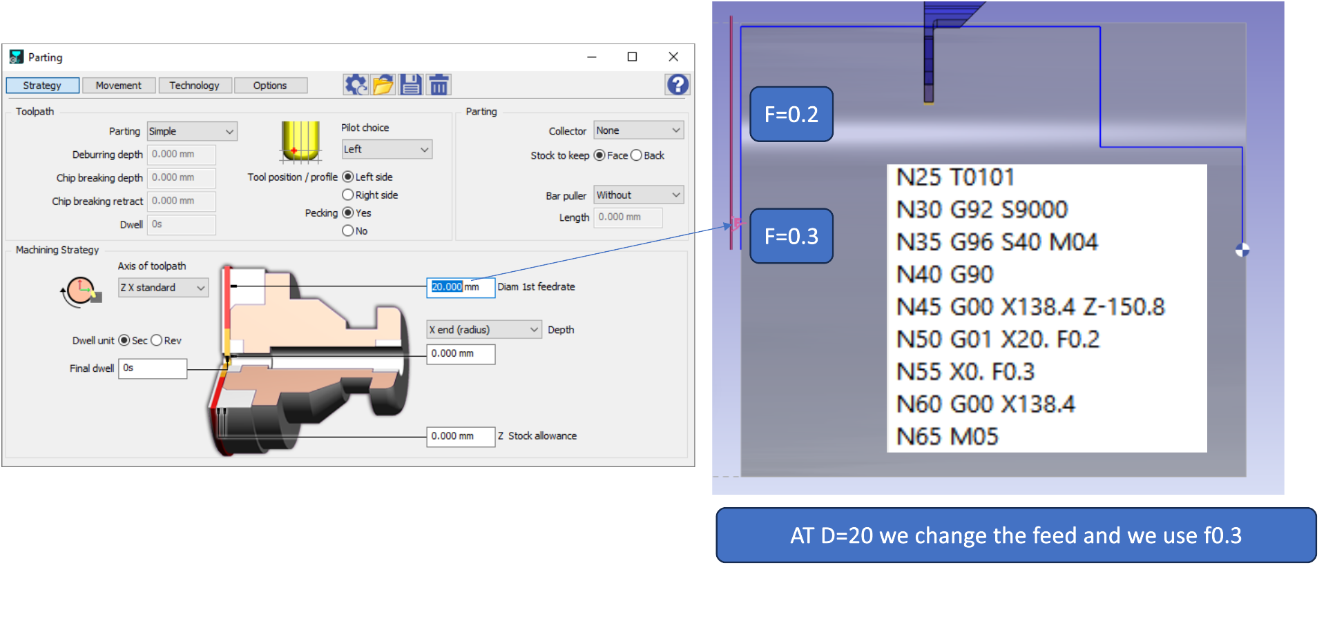 The Diam 1st feedrate value, for instance in this case 20mm, allows the parting tool to cut through the stock in the X direction at the specified 1st feedrate value in the Technology tab, up to the stock diameter of 20mm (in this case, the parting is carried out from 138.4 to 20mm at that feedrate). After this point, the value of the feedrate changes to the 2nd feedrate in X value until the parting is completed. | ![]() |
