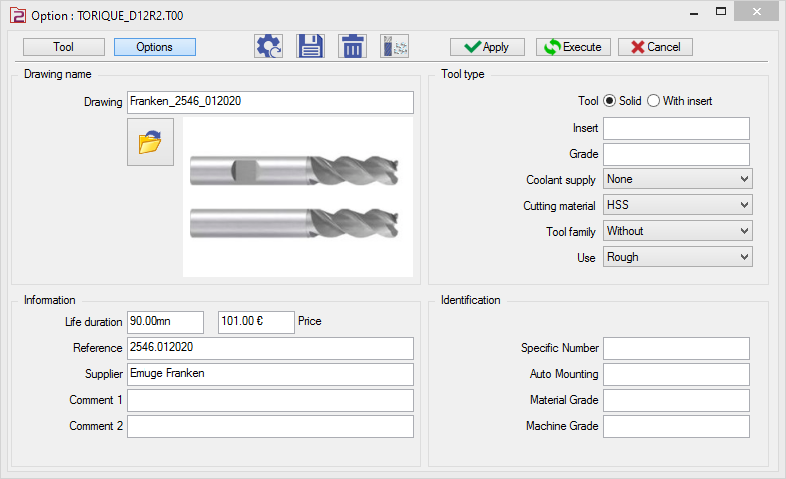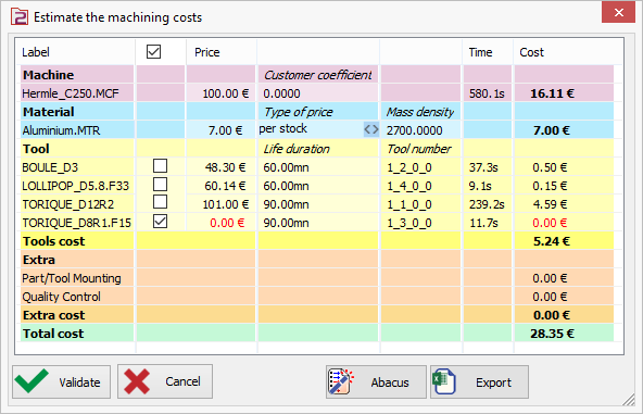 ![]() | The checkbox for each tool gives the possibility to give an approximative price from an Abacus. This abacus is the file Cost.xml in the folder Mat. You can customize this file with your own values. Check the box for the tool that have no defined price, then click the ‘Abacus’ button at the bottom. The tool will be given a price, this line is displayed in Italics. |