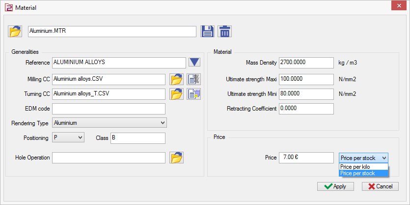 The values of Mass Density and price per kilo are used to calculate the price of material according to the volume of stock. You can also choose to define the price per single stock if it is known.