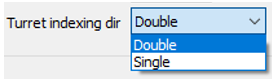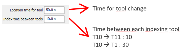 These 2 options, Location time for tool and Index time between tools, set the time for a complete tool change. Location time for tool is the time for a tool change between 2 cycles, excluding the time for tool indexing in the turret, which is defined by the Index time between tools.