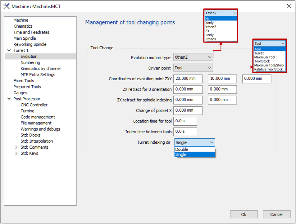The Evolution Point is the tool changing point. It is accessible in the machine editing window which allows various configurations for the management of the tool changing points: