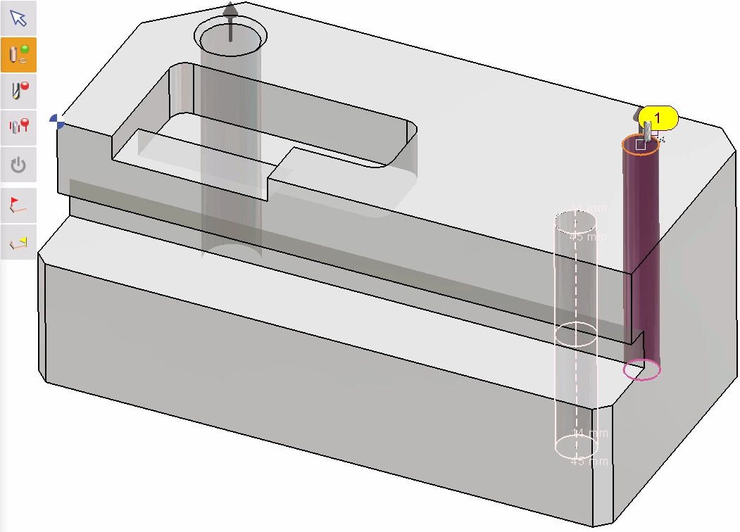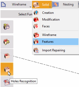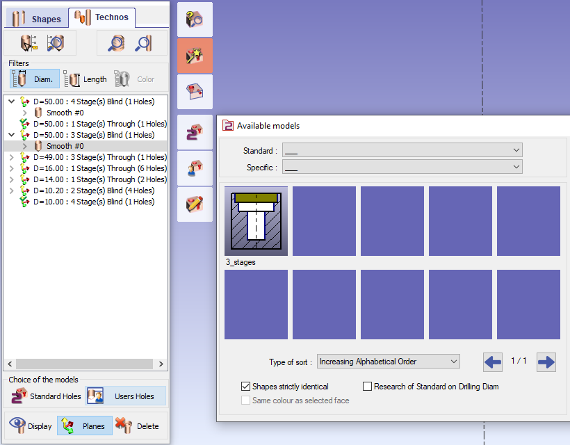 During the Holes recognition step, upon selecting the required hole(for instance we will choose a 3 stage hole), we have two possibilities to assign a user hole to the selection. | ![]() | |