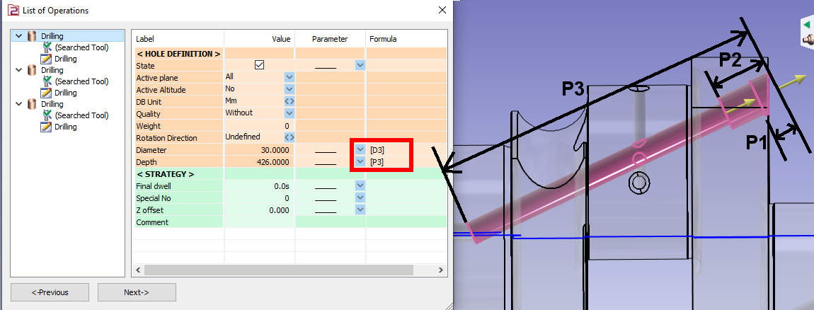 As for the list of operations, they are arranged from the smaller to the bigger diameter. (D3>D2>D1) We can click on next and finally name and save the model after which it will be applied to the selected hole in the technos tab. | ![]() ![]() | |