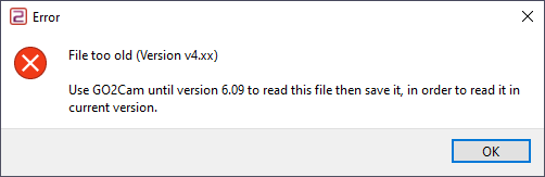 This *.PCE file is dating from version GOelan V4.xx and older. Those files can not be read anymore! (For your information, the last version GOelan V4.7 dates from 2002!) To recover those Version 4 *.PCE files, open them in GO2cam V6.09 or previous version and save them into readable *.PCE files. | |