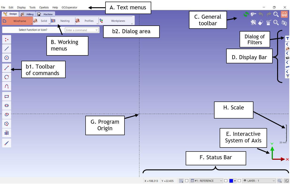 B. Working menus: just below are the tabs and menus to accede to GO2cam’s commands according to the job to do (design, wireframe, solid, milling, etc.).