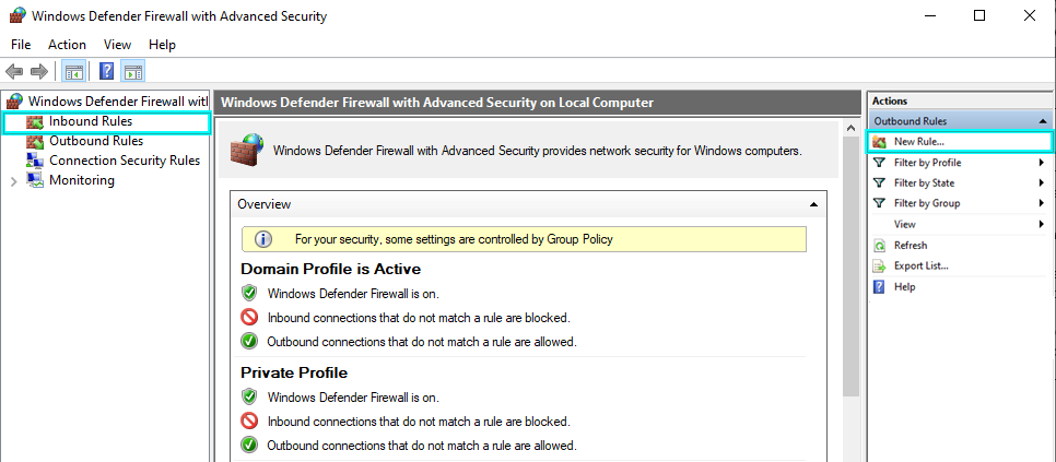 In Windows firewall, two new rules have to be added for incoming traffic. Click Inbound Rules, then New Rule…