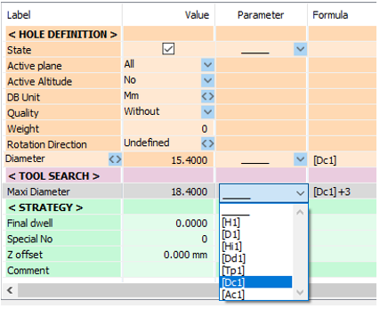 The editor enables to manage parameters for each operation. These parameters are sorted in 3 categories : Holes definition, Tool Search and Strategy. The field which are greyed only display information, the other fields can be modified by defining formulas.