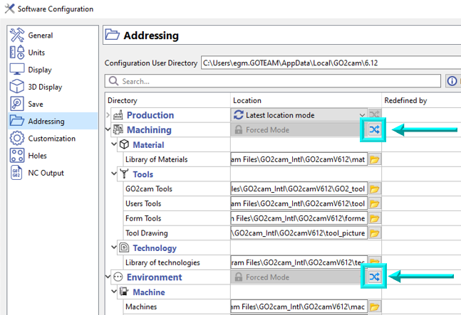 You also have the possibility to reassign addressing locations collectively. By selecting a main directory (either local or on a server), all folders under it can be redirected to the chosen directory. If a predefined subfolder (e.g. mat, tool, etc.) does not exist in the selected directory, it will be created automatically. This option is only available for Machining and Environment directories, as they can only be used in Forced Mode. | ![]() |