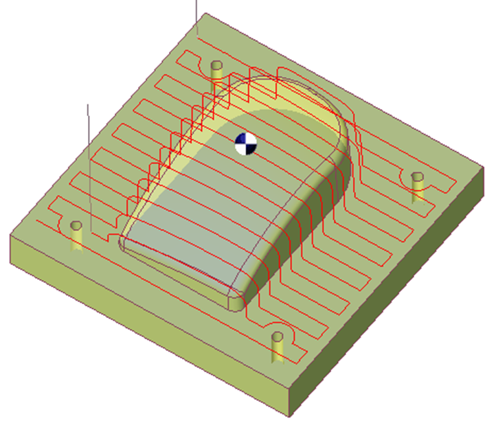![]() | Finishing by parallel plane works in parallel passes following the surface, with a constant pitch in the plane. On parts containing vertical walls, the constant pitch in the plane will leave ridges on these walls. |