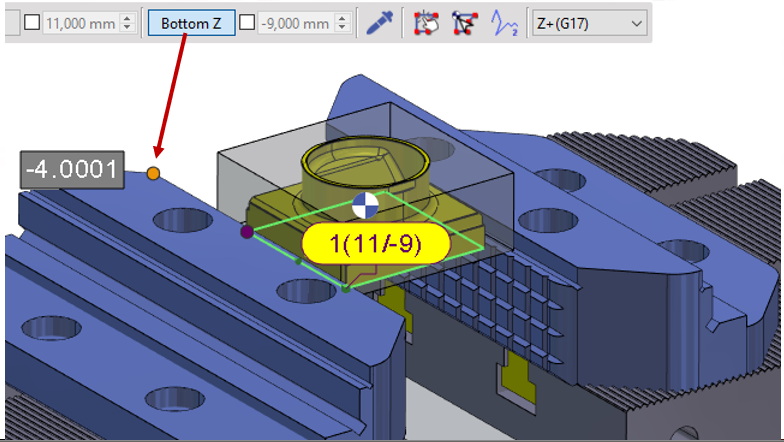 The picking of the Z value is also very useful in defining and adjusting machining depths. The pipette or the Bottom Z button can be used for this function. | ![]() |