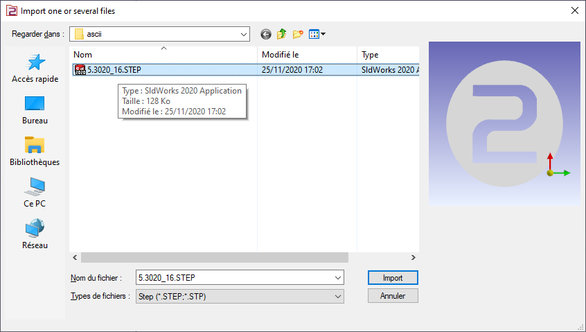 Select the import option to be applied to the solid. Click “Apply” The axis system can also be imported from solid CAD files by activating the Wireframe Import option. This feature is particularly useful for creating holders by importing STEP files from databases such as Sandvik or Iscar. It allows the recovery of the axis systems for positioning inserts, as illustrated for the turning tool in the image on the right. | ![]() |