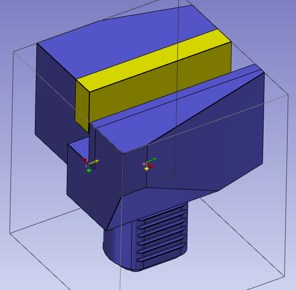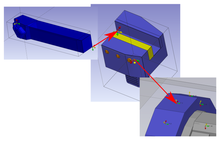 Select the faces to orient Z and X axes and point to define the system of axis. The system of axis referenced 0 define the point that will mounted on the previous element. The previous element can be a tool support or another tool holder component. The center of a circle can be selected by pressing CTRL + SHIFT and then clicking on the arc edge. Check the “change of direction” command to change the Z direction. | ![]() |