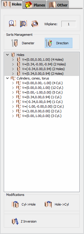 Information and devices regarding the holes of the analysed solid. The holes analysed are displayed in a table and are sorted in 2 types, holes and other elements (cylinders, cones, torus). |