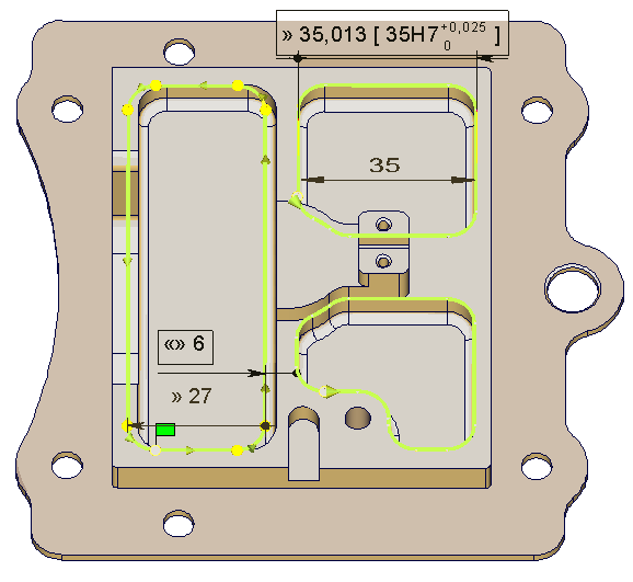 Accuracy: The pocket on the right top hand side corner is 35 mm wide. This is the value found by the control. The draft precises that the general tolerancing is H7. Thanks to the tolerancing, you can apply this value to the dimension and choose to machine the average value. In this case, this is the value 35.0125 mm. Topology: The wall between the pockets is 6mm in reality (read on the draft). In the model, the value is 5 mm. You can fix this mistake in the tolerancing menu. The whole pocket is moved, its width (27) is not modified. | ![]() |