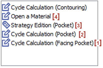 Machining list: creation and editing of operations, material actions, and techno commands.